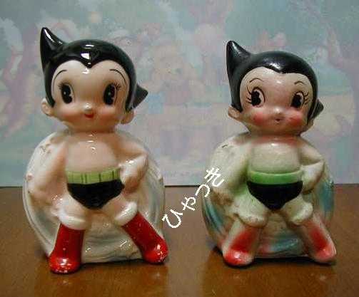 | ネットが発達して情報が著しく増大した今となっては、怪しいもんですが、以前は、アトムの当時物貯金箱で陶器製のものは4種類あるといわれていました。今回は、そのうちFig.1に示したタイプの貯金箱についてのレポートです。 他の3種類をFig.2に示します。(いずれも無版権です。)Fig.1の貯金箱は、他の貯金箱とはまったく雰囲気が異なります。(虫プロの版権もあります。)かわいらしい造形もプロポーションも素晴らしく、造形の完成度は群を抜いています。(もっとも、まるまるとしたアトムもいい味なので、私的には、どのアトムも好きですが。。。) |
