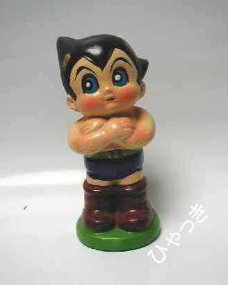 | Fig.6にて私が持っている物で、オリジナルとレプリカが揃っている例を二つ示しておきます。(それぞれ左がオリジナル、右がレプリカ) (a)は、大和銀行のアトム貯金箱の例です。うーん。大分違う。 (b)は、浅草玩具の大型ソフビ。レプリカといっても、ガレージキットの雄、ビリケン商会殿が、版権を取って復刻した優れものなので、造形はきちんとしていますが、大きさは、やはり一回り小さくなっています。ちょっとダイエットしたアトムですね。 |