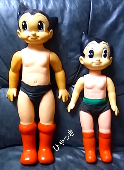 | 実は、浅草玩具からはFig.4のような高さ55cmのアトムの人形も販売されています。一見同じ人形に見えますが、上の方で紹介した歩行ギミック付きのアトムより高さが頭一つ分大きいです。(Fig.5) Fig.6(a)〜(d)に、両者を詳細に比較します。いずれも、左が48cm人形、右が55cm人形ですが、頭部、体、腕、足のいずれも異なるパーツであることがわかります。 目の形式が異なる点は、両者を見分ける重要なポイントです。 |