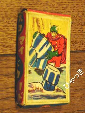 手塚関係メンコは数多くありますが、この人型メンコは傑作だと思います。 虫プロの版権がありますが、絵柄は古典的。 悪役顔のお茶の水博士に注目してください。 |