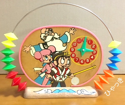 | こどもに数の概念を教えるための知育玩具。実際にコマを動かしながら数字との関係を理解させるもので、今も同じようなものが使われています。 時計盤もついていて、長針を動かすとレオちゃんの目が上下する仕掛けが組み込まれています。 おそらく浅草玩具から発売されたものだと思います。 |