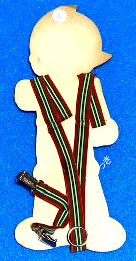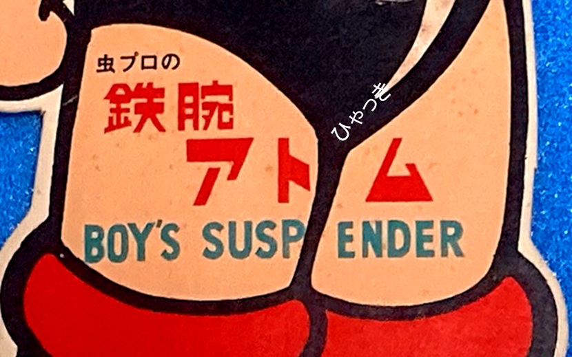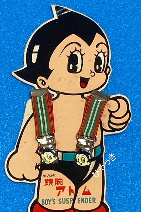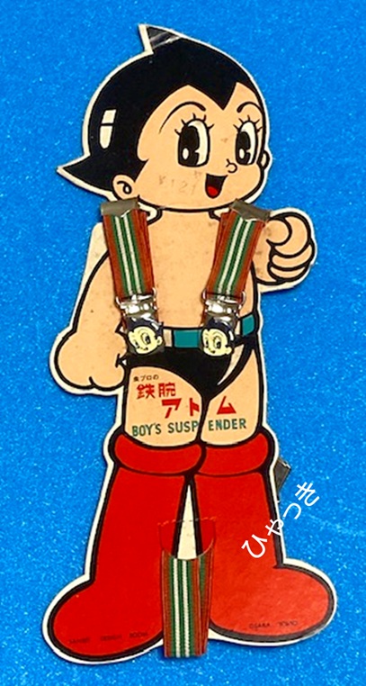 | 商品名「鉄腕アトムサスペンダー」。(SANREI DESIGN ROOM) サスペンダーとは、いわゆるズボン吊りの事です。ベルトが使えないくらい小さな子がよく使いました。何となくおしゃれな感じでしたね。 下のようにアトムに装着して売られていたようです。アトムのパンツにはサスペンダーが必要ないのですが、とてもカッコ良いので、これを見た子供達は「僕も着けたい!」と思ったでしょう。 アトムの足元に「SANREI DESIGN ROOM」というロゴが印刷されています。製造元かもしれませんが、今はこの名前の会社は見当たりません。 |