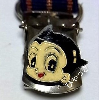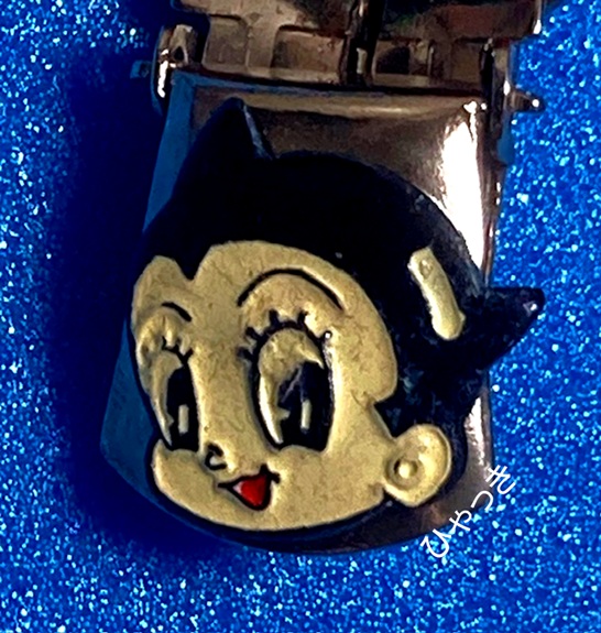 | 商品名「アトムマグネットベルト」。(カワムラ) バックルの部分が磁石で結合する仕掛けのベルト。 使われているアトムのプレートは、上で紹介しているサスペンダーのものと同じ。ということは、上のサスペンダーもカワムラ製かもしれない。 |