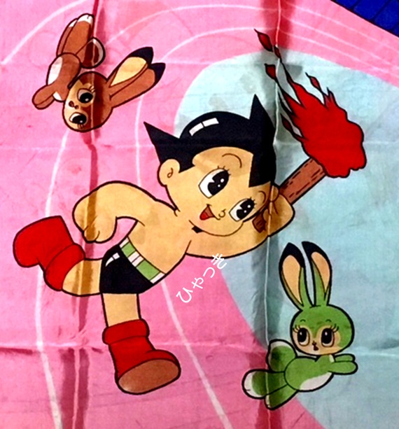 | シルクのような感触の布で作られているスカーフだと思います、 アトムがたいまつのようなものを持っています。1964年の東京オリンピックの頃に用いられた構図です。 |