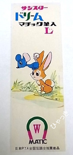 | 手塚先生オリジナルイラスト付きのサンスターの筆入。店頭用の売り箱も残っている。 手塚治虫というサインと先生の似顔絵マークがついているので、虫プロ倒産から間がない頃のものと思われる。 「マチック」は、馬蹄形磁石の絵に添えられている「MATIC」というロゴをそのまま日本読みで表現したものらしい。「MAGNETIC(マグネティック)」の略語か?蓋が磁石で閉じられるため、壊れやすかったファスナーなどより使用寿命が伸びるということをセールスポンイトとしていたが、実際は子供が乱暴に扱いビニールが破けたりしていた。中には、カミソリでカバーを切り裂き磁石の部品を取り出してしまう者もいた。(私も?) サンスターからはたくさんの手塚関連キャラの文房具が販売された。 どれも素敵なアイテムばかりだった。 |