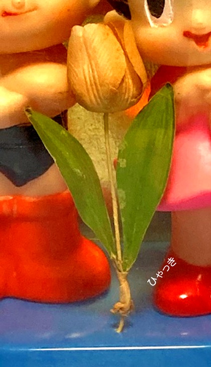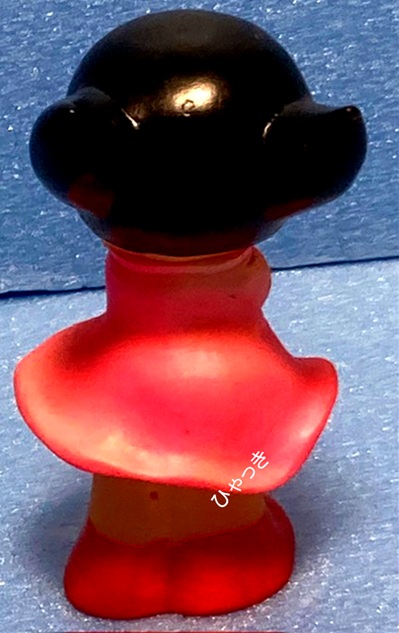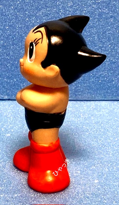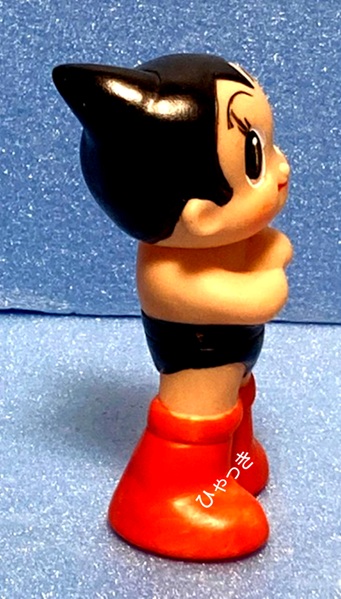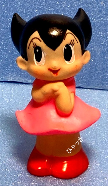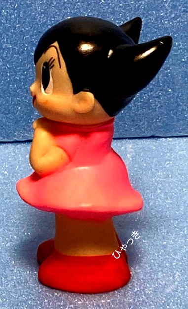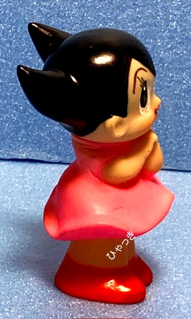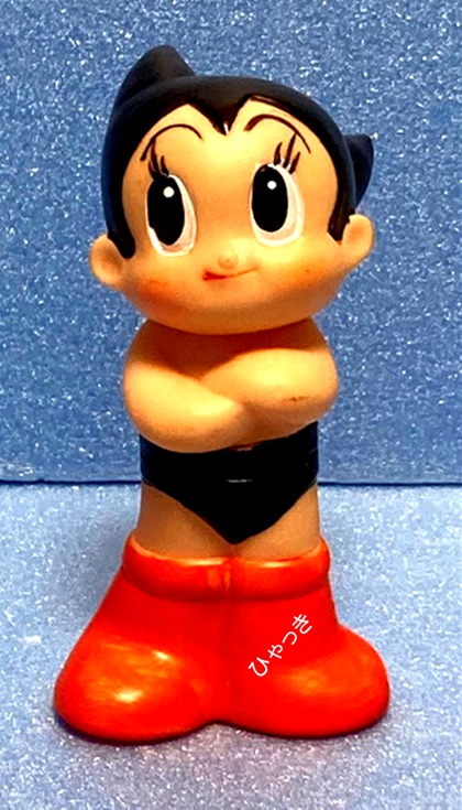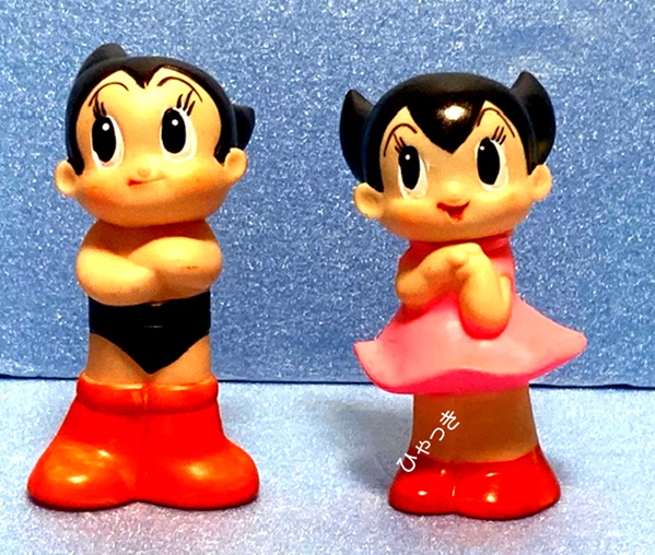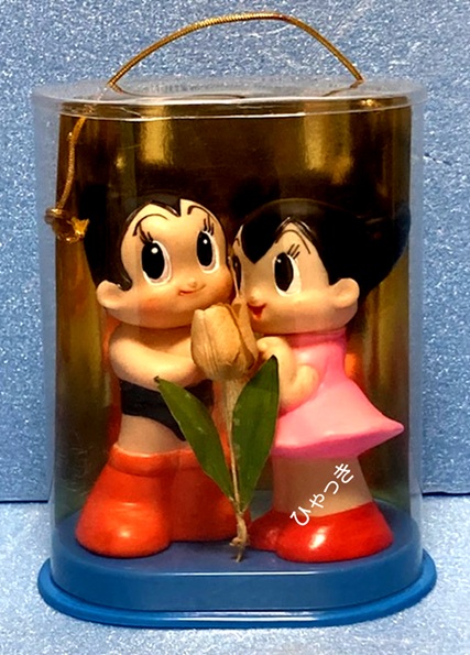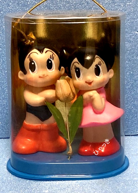 | 商品名「アトム&ウランソフビセット」(浅草玩具)。 アトムとウランのソフビ+お花(チューリップ?)がケースに入っています。退色していますが、わずかに彩色が残っている部分から紅色のチューリップだったようです。このソフビは、積木のセットなどに組み込まれて販売されています。 ここで使用されているケースは、すでに紹介した「アトム・ウラン・ラビーソフビセット」とまったく同じです。基本的にはケースのままディスプレイするためのものだと思います。クリスマスや正月のような特別な時に売られていたのかもしれません。 |