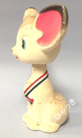 大きなサイズの北山陶器製レオの首振り人形。 すでに紹介している小さいサイズは高さ約14cm、大きいサイズは約19cm。ほぼ同じポーズだが顔の形が四角くなっていること、黒目の方向が逆、首飾りに小さなビーズ玉がついていることなどが違っている点である。