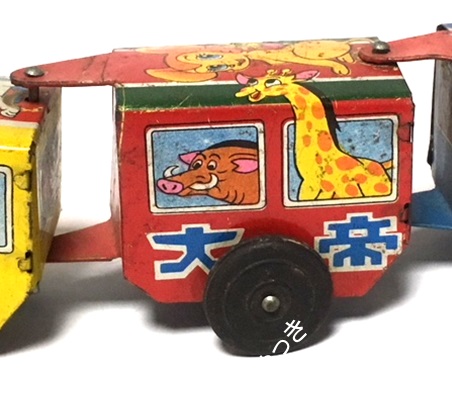 レオが機関士の汽車が鐘を鳴らしながらゼンマイ動力で客車を牽引する。
