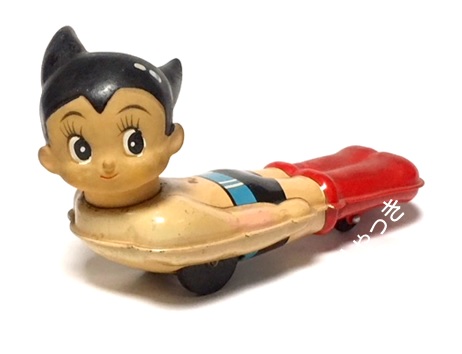 腕を腰につけた飛行ポーズのアトム。フライホイール方式で平らなところで走らせる。