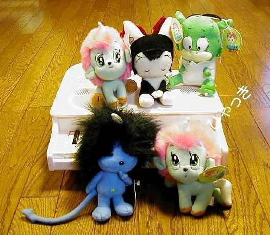 上のぬいぐるみの生い立ちを探求してからだいぶたちましたが、ようやく、わかりました。これは、クレーンゲームの景品だったようです。なんと、下の写真のように5種類もあったことが判明しました。チャオと悪魔の子のほかに、卵の殻をつけた恐竜の子供のようなキャラもあります。(ごぞんじの方。この子の名前を教えてください。)