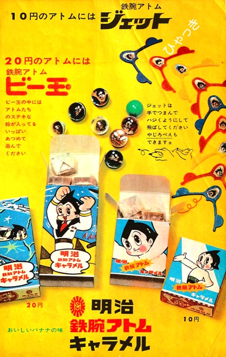 アトムジェットがどのお菓子のおまけか不明でしたが、最近、昔から持っていたカッパコミクス鉄腕アトムの裏表紙に答えを発見しました。((i)ご参照方)