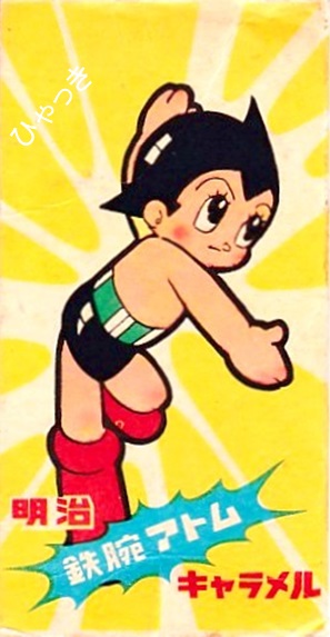 | (*−1)、(*−2)と*が共通な2枚は、箱の裏表のイラストのペアです。 ショートタイプ箱のアトムキャラメルは、箱のイラストがすべてにアトムが描かれていましたが、こちらは、片面にアトム、反対側の面には、ウランちゃん、ヒゲオヤジ、お茶の水博士などが描かれています。 鉄腕アトムのロゴが、星形強調タイプなので、最初に発売されたものと考えていますが、ショートタイプが発売されてから少し後に売られたのかもしれません。 |