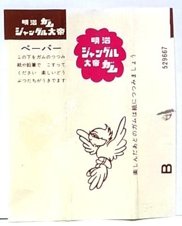 明治製菓ジャングル大帝ガムのパッケージです。アトムガムと同様に包まれた形から一枚の紙片に展開し、外側の透明なフィルムを台紙から剥がすとそのままシールになります。