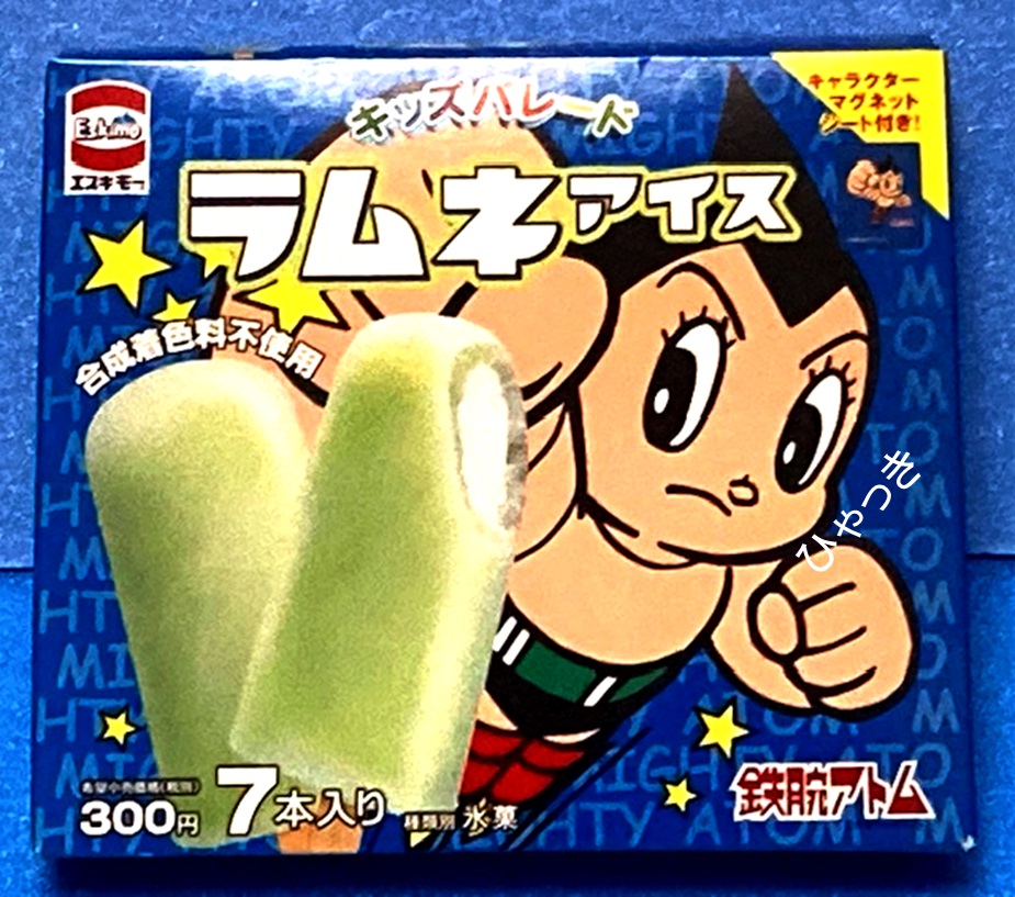 | エスキモーのキッズパレードアイスです。アトム、レオ、BJの手塚キャラクターが使われていて、それぞれのキャラクターのイラストが印刷されているマグネットがおまけとして入っていました。 箱の両面には、縦置配置、横置配置のイラストがそれぞれ印刷されていました。それぞれのキャラクターごとに、アトムはラムネアイス、レオはバニラアイス、BJはチョコアイスと異なるアイスが入っていました。 手塚先生が亡くなられた後のもので、確か20年くらい前の物だったと思います。たまたま、お酒を買うために立ち寄った酒屋さんに置かれていたアイスクリームの冷凍ケースの中に入っていました。結局お酒ではなく、アイスクリームをたくさん買ってしまいました。家族の不評の中で、おまけのマグネットを集めるのにとても苦労しました。それぞれのキャラクターごとに5種類あるようです。 「エスキモー」は森永乳業が立ち上げたアイスクリーム製品のブランドで、現在は森永乳業に統合されたため消滅しています。森永乳業からは、海のトリトンのアイス製品(トリトンアイス、トリトンコーン)が販売されましたが、エスキモーブランドではなく森永乳業ブランドとして販売されています。 |