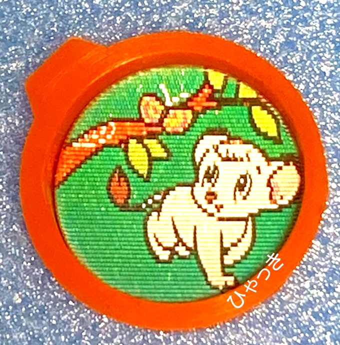 「ミラクルキャップをあつめよう!」という文字があるが、どのようなものか不明。 もともとロッテのポップルチョコレート円筒容器には、いろいろなキャップがつけられていたようで、例えばFig.4のような人形型や、Fig.5のようにキャップの中に巻物状のマンガが入っていたものなどもありました。 |