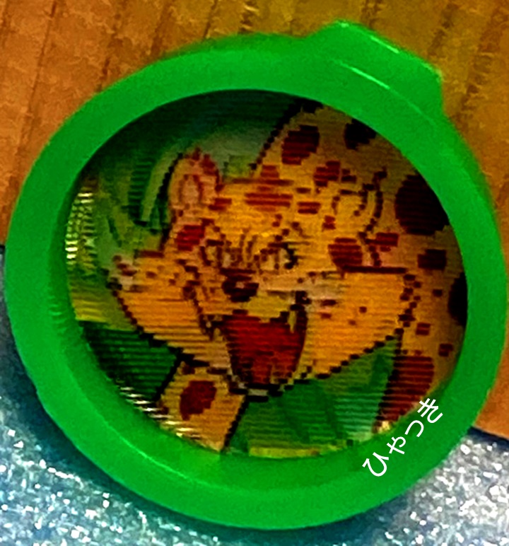 このHPで紹介している、手塚キャラ版のポップルチョコレートにつけられていたであろうキャップをFig.6に示します。 このキャップは見る角度によって2つの画像が現れる、いわゆるレンチキュラーレンズが仕込まれた円形のチップが入っています。(Fig.7ご参照方) キャップの種類は、鉄腕アトム、ジャングル大帝、リボンの騎士の3種類で、円筒容器側面に描かれているイラストのキャラクターと一致しています。 下にそれぞれのキャップの2つの画像を示していますが、いろいろと趣向が凝らされていて大変楽しいものです。 画像の乱れや、色合いが違っているものがありますが、なかなかうまく撮影できず、できるだけ見やすいように画像処理をしているためです。悪しからずご了解ください。 |